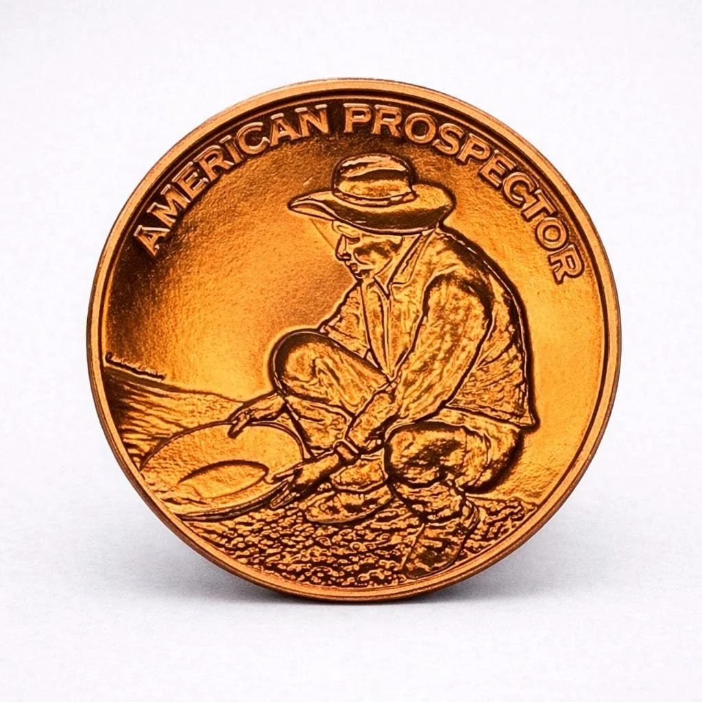 Add a timeless symbol of American history to your stack with this American Prospector copper coin, struck in one full ounce of .999 fine copper. Featuring the iconic prospector panning for gold, this classic design celebrates the spirit of exploration, hard work, and early American mining culture.